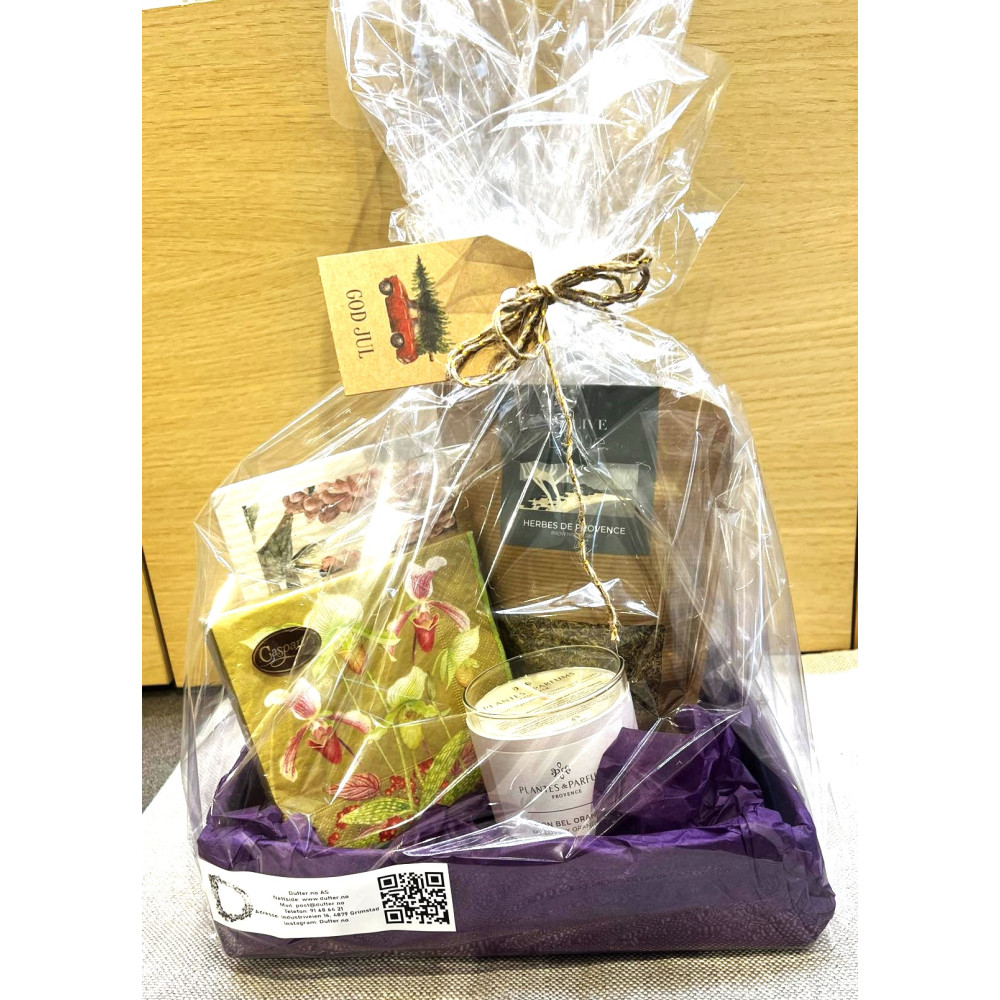 Pakken inneholder et pent duftlys, en pakke servietter, en krydder-pose og en klut .