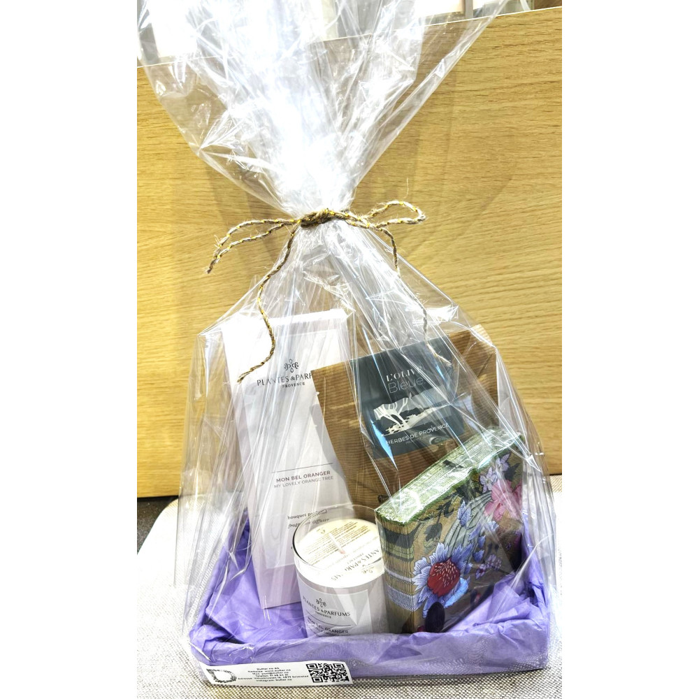 Pakken inneholder et pent duftlys, en pakke servietter, en krydder-pose og en klut.